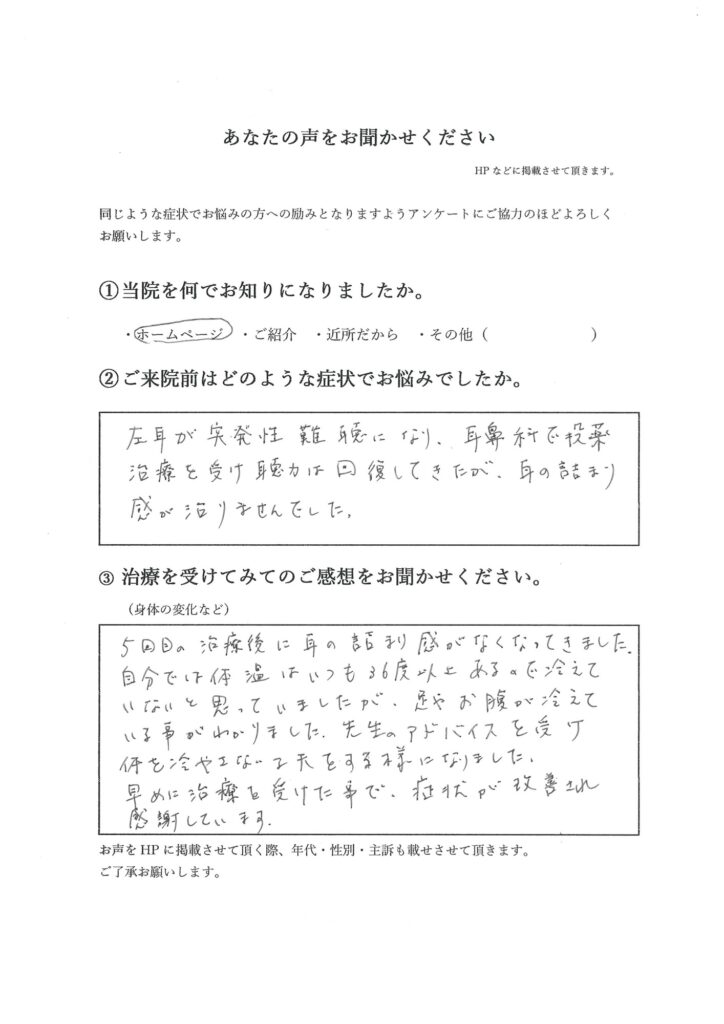 5回目の治療後に耳の詰まり感がなくなってきました。自分では体温はいつも36度以上あるので冷えていないと思っていましたが、足やお腹が冷えている事がわかりました。先生のアドバイスを受け体を冷やさない工夫をする様になりました。早めに治療を受けた事で症状が改善され感謝しています。